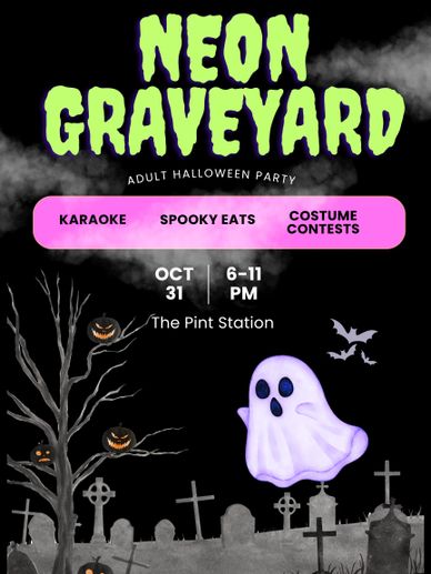 Our annual Neon Graveyard Halloween Party is 10/31 6-11p. We will have karaoke, spooky bites & a costume contest for best male, best female, best duo, best group. This is an event you don't want to miss!