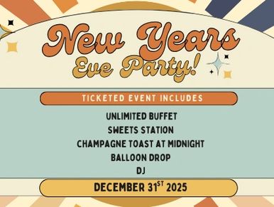 Join us for the best party in town! No dress code, come however you like! Unlimited buffet, a sweets station, champagne & balloon drop at midnight, dj & karaoke. Ring in 2026 stress free!
