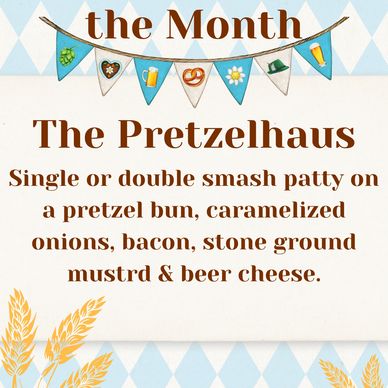 The Pretzelhaus. Single or double on a pretzel bun, caramelized onions, bacon, beer cheese, stone ground mustard.